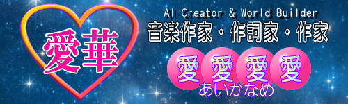 当サイトは、AIクリエーター&World Biollder 愛華、またの名を愛愛愛愛(あいかなめ)またの名を、はなももの公式WEBサイトです。総称:愛華は、自分の世界の表現者として、音楽作家、作詞家、作家いとしての、活動情報や自己紹介、リリース作品の情報配信や、グッズ情報などお届けしていきます。